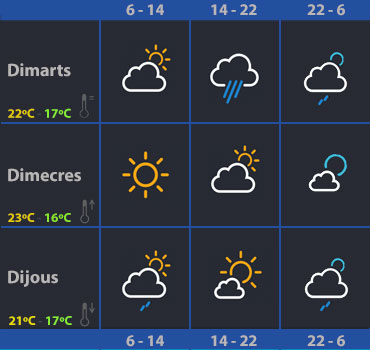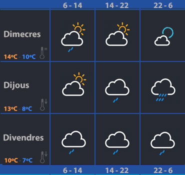 Previsió per als dies vinents: Dimecres més estable amb més sol i alguns núvols a la tarda, les temperaturesmàximes pujaran una mica. Dijous continuarem amb una mica d'inestabilitat podria ploure al matí i cap al vespre, temperatures més baixes. Divendres i dissabte variable amb alguna gota despistada i diumenge més núvols. Temperatures sense canvis importants.